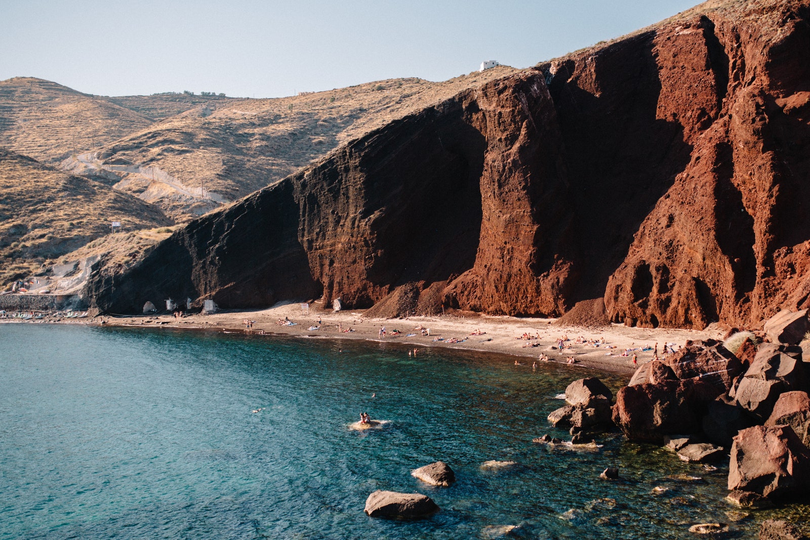 Plajă iconică din Santorini, acest loc de vis combină roci vulcanice aprinse și o mare cristalină. Este unul dintre locurile preferate pentru scafandrii locali. Atenție la alunecările de teren.