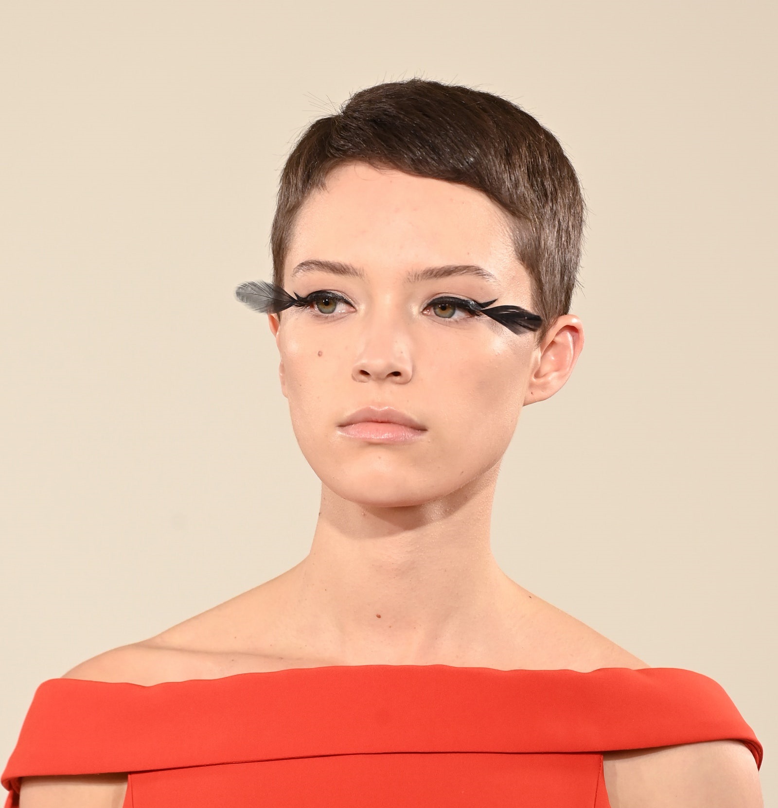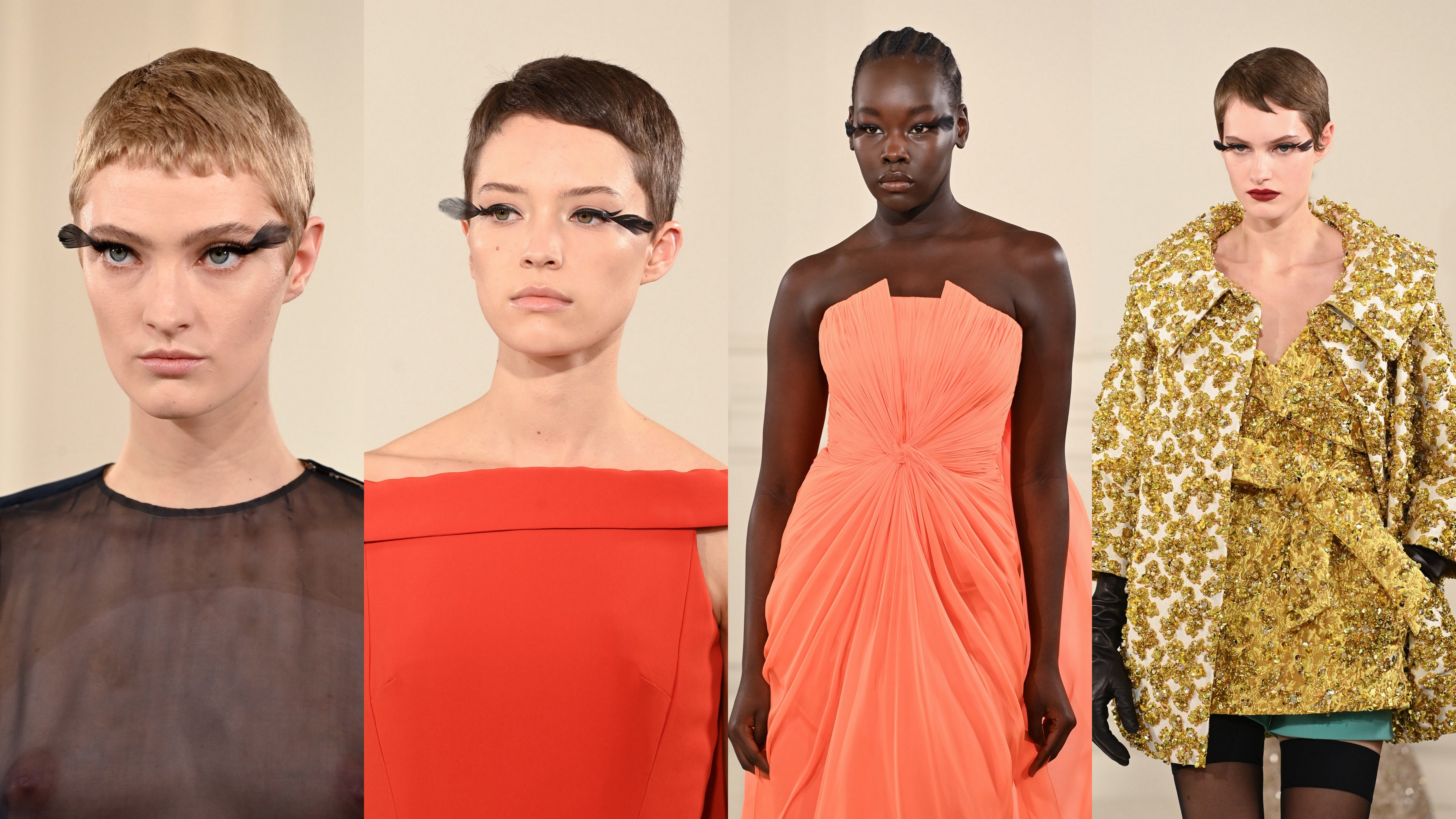 Aerisite, de vis, penele alunecă ici și colo la spectacolul haute couture Valentino, cusute pe o rochie neagră sau purtate ca un colier la gât. Aliniat cu acest elan poetic, make-up artistul Pat McGrath sublimează ochii modelelor cu două pene negre înlocuind genele, îmbunătățite cu un eyeliner.