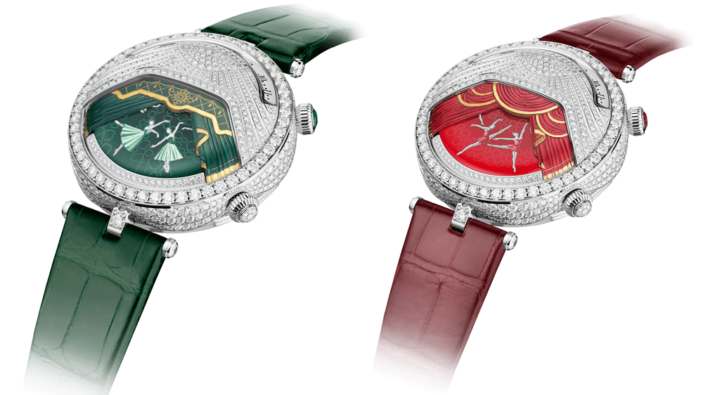 În timp ce sună muzica, balerinele pictate în diferite ipostaze de dans plutesc pe un disc care se rotește printr-o deschidere puțin mai mare decât cea a unui afișaj tipic de fază lunară. Aici, deschiderea este menită să reprezinte o scenă, înconjurată de perdele sculptate, gravate și pictate manual. Atât draperiile, cât și balerinele sunt încrustate cu smaralde și rubine. Scena este pavată cu diamante, iar pe cadranul superior se află un candelabru în cascadă peste scenă. Diamantele laterale ale carcasei sunt de asemenea aranjate astfel încât să cadă ca niște pliuri de țesătură peste coroane. Cea poziționată la ora 2 este acoperită cu o piatră prețioasă în conformitate cu fiecare temă - smarald, rubin sau diamant.