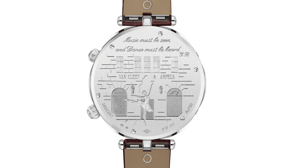Carcasa din aur de 18 karate de 44,5 mm este setată cu 7,92 carate de diamante. Funda este deschisă, dezvăluind o gravură în basorelief a unei balerine care poziționează în poziție de atitudine în fața buticului Van Cleef & Arpels 5th Avenue din New York, unde Claude Arpels l-a găzduit pe George Balanchine în 1966 pentru o vizionare privată.