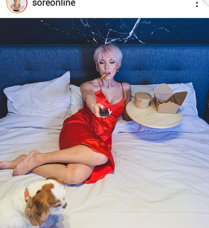Sore s-a relaxat și ea după ce era cât pe ce să rămână fără portofelul cu acte sau mobil. Așa că și-a comandat ceva bunătăți, și-a luat un halat roșu pe ea, și-a luat cățelul în pat și au început să se uite la televizor la un film pentru oameni maturi. Așa că și-a mai revenit după sperietură.