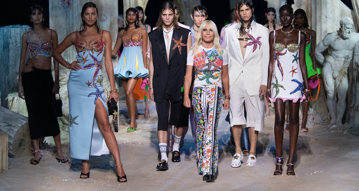 Amplasate într-un spațiu acoperit cu nisip, slab luminat, ornamentat cu stâlpi romani rupți, modelele făcute să arate ca niște creaturi marine strălucitoare - părul umed, pielea strălucitoare - au adus la viață viziunea maritimă pentru primăvara anului 2021, care a readus moda italiană imprimeul Trésor de la Mer al casei, proiectat inițial de Gianni Versace în anii '90.