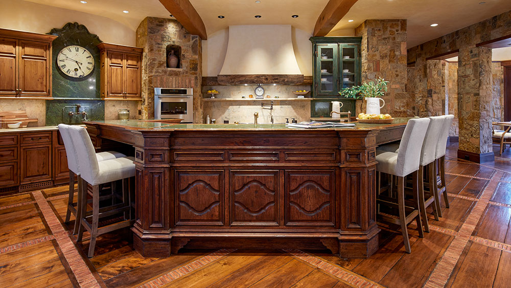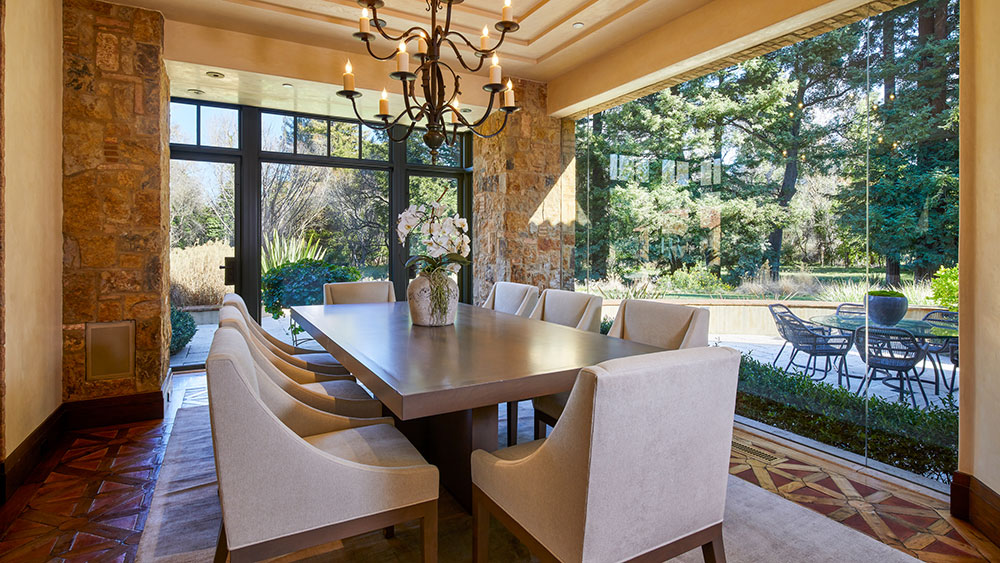 Bucătăria de familie are pardoseală din lemn italian, un ceas italian, amplasat în marmură verde ornamentată, sculptată și o insulă supradimensionată pentru ca oaspeții să vadă toate preparatele. Ușile încadrate din metal se deschid către o altă caracteristică minunată a casei; loggia acoperită de lângă piscină, cu șemineu în aer liber, tavan cu grinzi din lemn și lumini vechi italiene de trăsură metalice. La etajul al doilea se află suita primară cu lambriuri din lemn – unul dintre cele trei dormitoare din casa principală. Are o cameră de zi alăturată, o baie extinsă cu gresie italiană mai veche și o cadă de sine stătătoare cu vedere la pajiști.