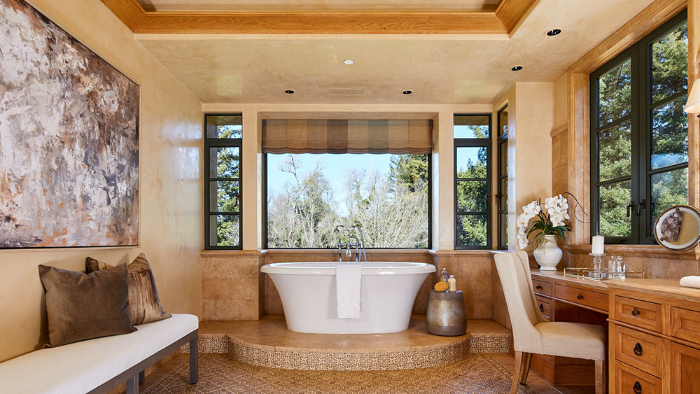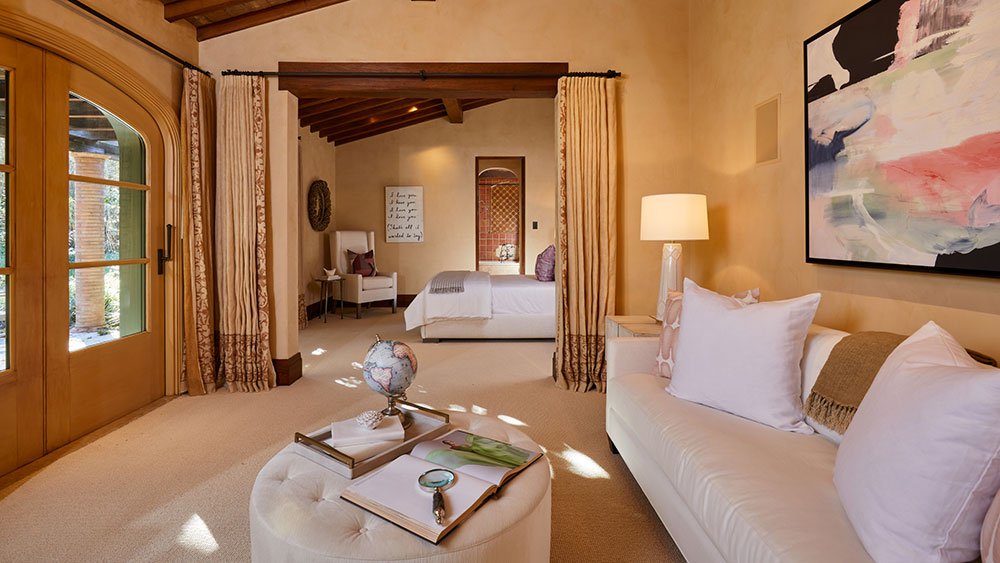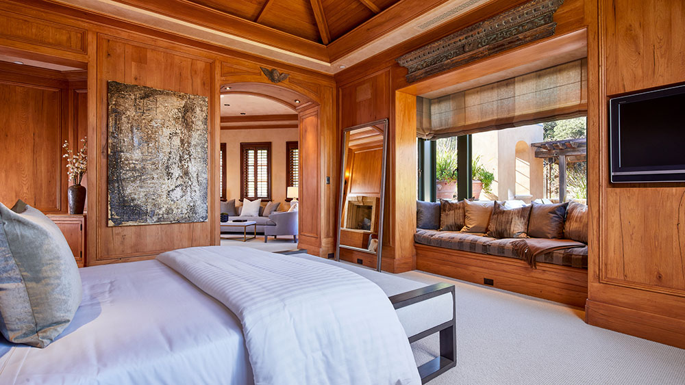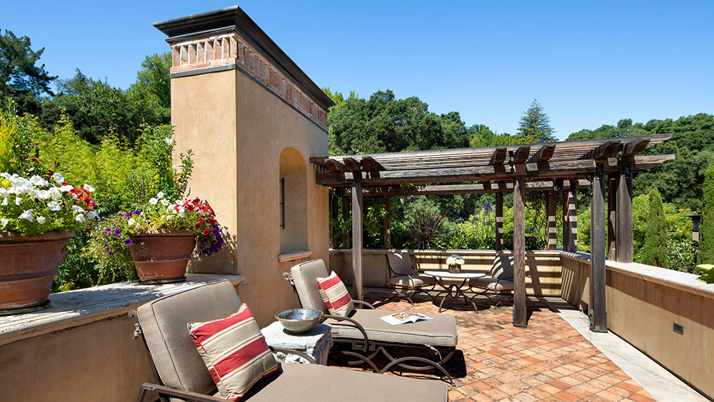 Chiar lângă dormitorul primar se află o terasă privată pe acoperiș, pentru a vă bucura de soarele din California. Clipiți și ați putea fi în mediul rural toscan. Și, ca o adevărată moșie italiană, nu există lipsă de clădiri. Acestea includ o casă de oaspeți de 1.400 de metri pătrați alături de piscină, o căsuță de îngrijire cu un dormitor, o sală de gimnastică autonomă și un garaj pentru trei mașini. Proprietatea are în mod natural un teren de bocce și un teren de tenis. Sau pentru o adevărată degustare de vin în aer liber, există o poiană printre falnicii copaci, cu o masă din lemn rustic și iluminare de la un candelabru din lemn antic.
