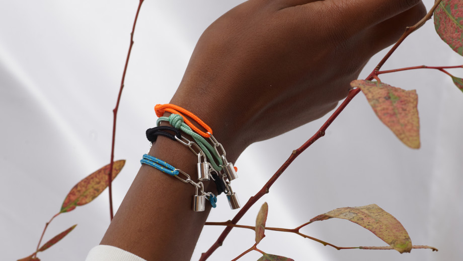 Brățara, disponibilă în culorile portocaliu, negru, verde și albastru, poartă semnătura lui Abloh cu lanțuri îndrăznețe, grele, farmecul Louis Vuitton și un lăcățel. Noul accesoriu se vinde cu 400 de dolari, din care 100 vor merge la UNICEF.